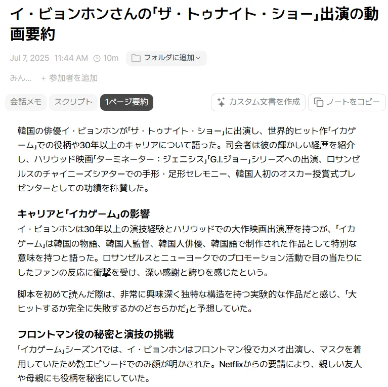 Tiroの翻訳は、単に単語を置き換えるだけではありません。会話の文脈やニュアンスまでを正確に読み取り、自然な日本語へと変換します。特に、イ・ビョンホン氏のウィットに富んだユーモアや、誠実な回答のニュアンスが、日本語でも生き生きと伝わってきます。