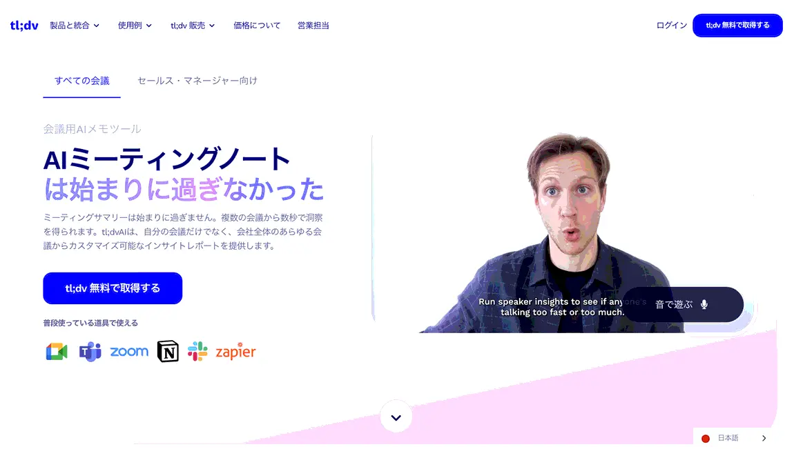 tl;dvは、Zoom、Google Meet、Microsoft Teamsと深く連携するAI議事録ツールです。