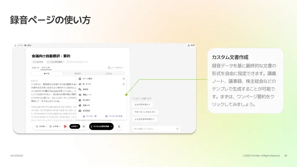 カスタム文書作成ボタンをクリックすると、AIが自動でノートを特定のフォーマットに再構成します。標準で用意されているテンプレートには以下のようなものがあります。1ページ要約IR・ピッチ議事録講義ノート株主総会採用面接繰り返し利用するフォーマットは