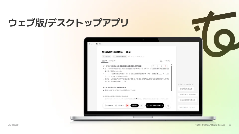 Tiroのウェブ版およびデスクトップアプリは、会議の記録を管理し、チームと円滑に情報を共有するための司令塔です。議事録の作成から、過去の会議内容の横断的な分析まで、あらゆるナレッジマネジメントがここから始まります。このプラットフォームをマスターすることが、あなたの生産性を飛躍させる第一歩です。