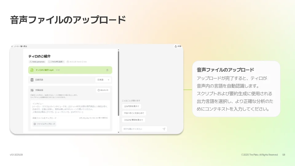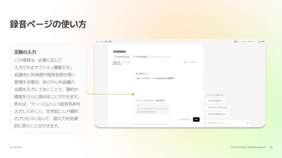 文脈の入力フィールドに記述することで、AIの認識精度が飛躍的に向上します。参照ファイルのアップロード: 関連資料(pdf, image, textなど最大5件)をアップロードすることで、AIがより深い文脈を理解し、要約の質を高めます。