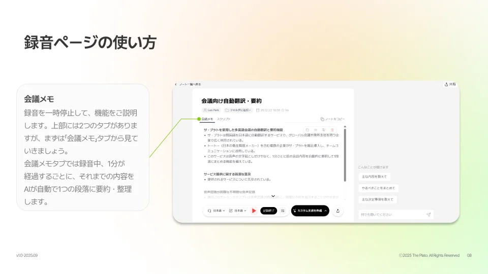 会話の記録(要約)、スクリプト(全文)、1ページ要約が生成されます。もちろん、Ask Tiro機能で追加の質問をすることも可能です。