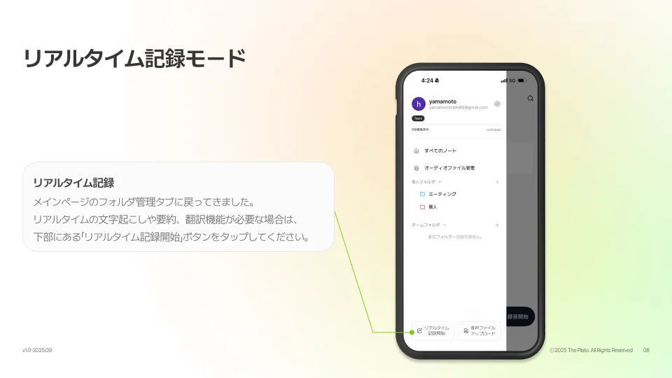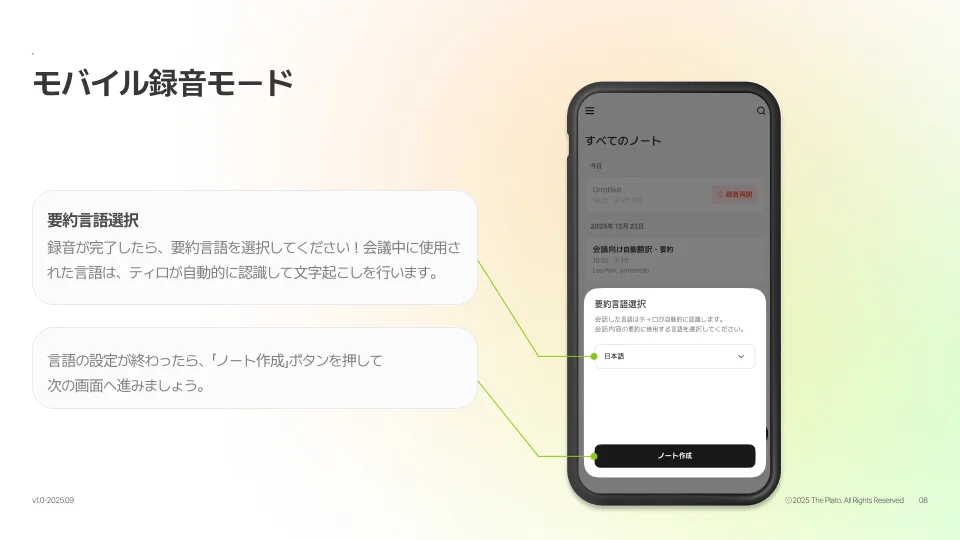 モバイル録音モード | オフラインでの会議やインタビューなど、後から要約・文字起こしを確認する場合に最適です。画面をオフにしても録音は継続されます。 |