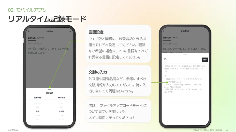 モバイルアプリには、用途に応じて使い分けられる2つの録音モードが搭載されています。