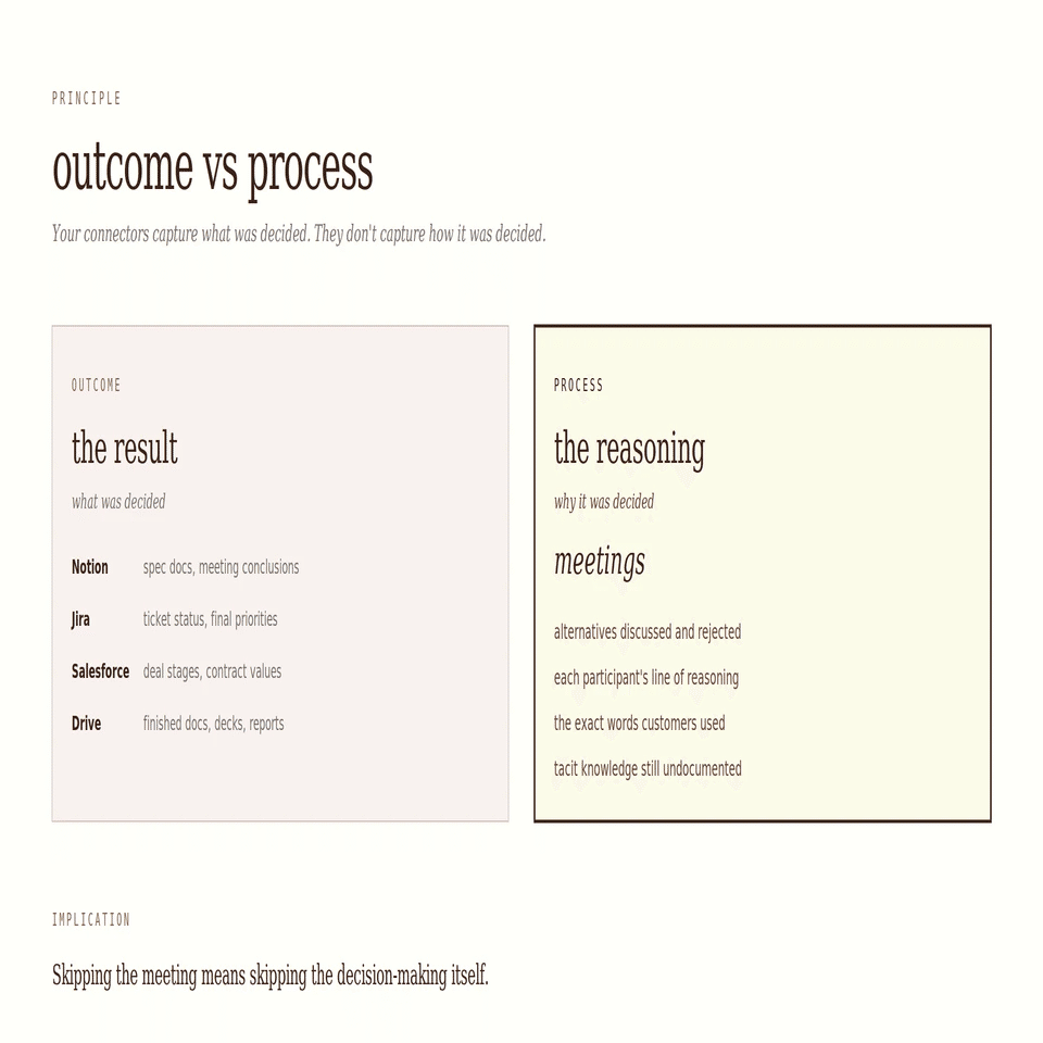 現在のコネクタが集めているのは、意思決定の結果です。意思決定に至る過程は取得できていません。そして、その過程に関する情報の90%以上は、重要な会話や会議の中で失われています。