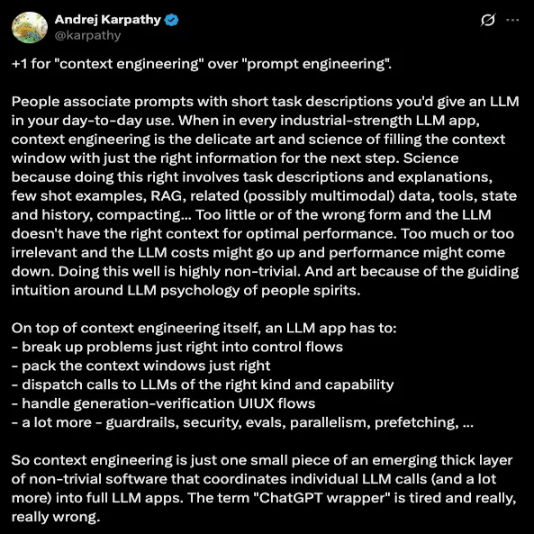 OpenAI共同創業者のAndrej Karpathy氏はこう述べています。「本質的な技術とは、コンテキストウィンドウを、次のステップに必要な“ちょうど良い情報”で満たすことだ。」