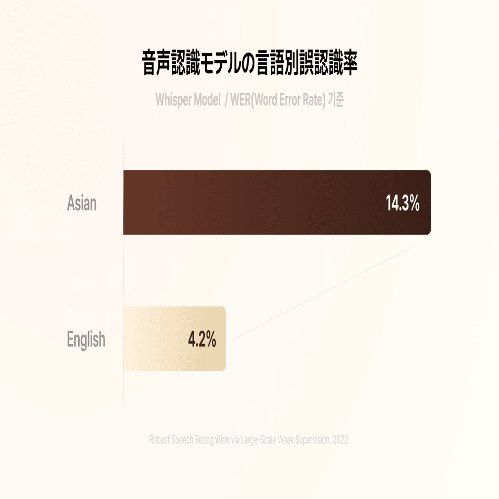しかし現実は少し異なります。現在広く使われている音声認識モデルでは、英語の誤認識率は約4%、同モデルのアジア語は約14%水準とされています。