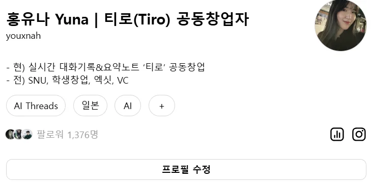 저는 스레드를 먼저 완전히 실명 기반으로 세팅했습니다. 링크드인과 개인 인스타그램 등 실명 기반이 익숙했던것도 있었고, 제 프로필이 스레드에서 먹히기 나쁘지 않겠다는 판단도 있었습니다.