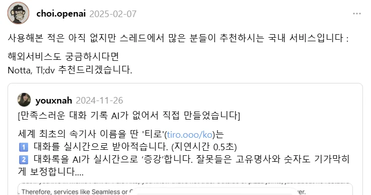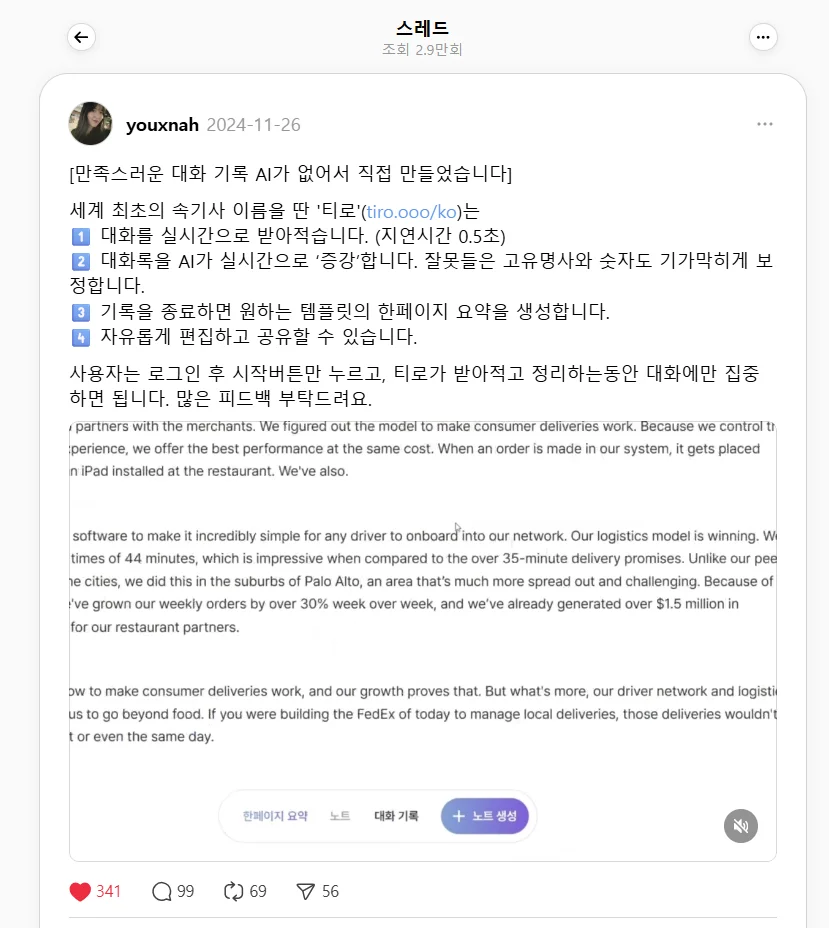 제가 작성한 게시글은 6개밖에 되지 않았던 이 즈음부터, 티로는 ‘스레드에서 많은 분들이 추천하는’ 공공연한 서비스가 되었습니다. 스레드의 명실상부 최고 인플루언서인 choi.openai님께서도 다른 분들의 추천으로 서비스를 인지하셨고, 제품을 사용해보신 뒤 약 7차례 저희를 소개해주시기도 했습니다. 모두 일절 보상없이, 심지어 별도 미팅도 없었던 순수한 자발적인 소개였습니다.
