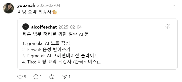 저는 먼저 otter, 클로바노트 등 이미 유명한 AI 회의록 제품을 추천하시는 분들께 제 제품소개 게시글을 댓글로 달았습니다. AI 제품을 소개하는 마이크로 인플루언서분들을 졸졸 따라다녔어요. 인스타로 직접 DM을 보내 커피챗을 하기도 했습니다. 어떤 게시글이든 티로가 언급되면 빠르게 찾아가 감사 댓글을 달았고, 노출이 잘 된 콘텐츠는 리포스트&리그램하여 트래픽에 힘을 더했습니다.