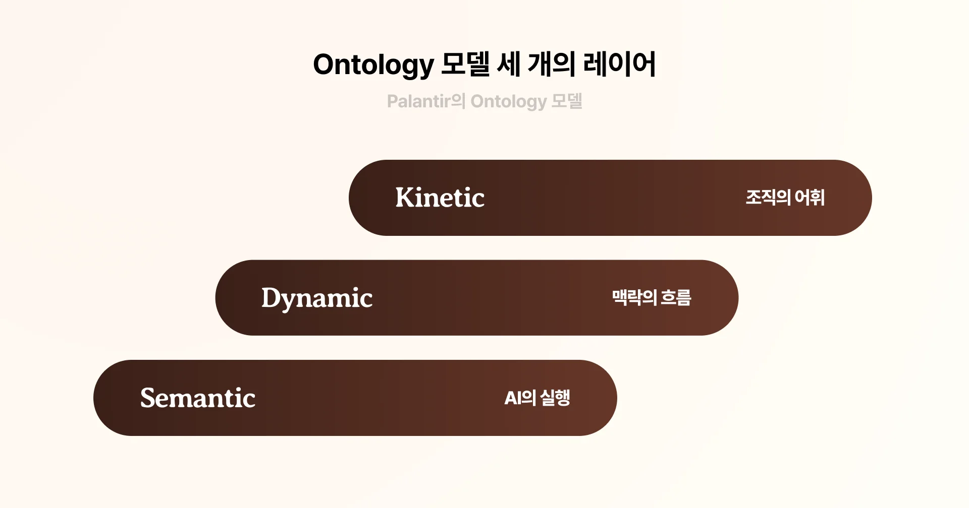 팔란티어의 Ontology 모델을 보면 세 개의 레이어가 함께 작동합니다. Semantic, Dynamic, Kinetic. 저희는 이 프레임을 AX 설계의 언어로 쓰고 있습니다.