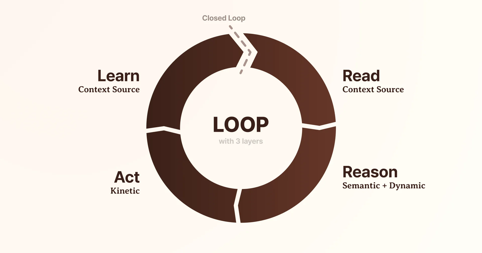 세 레이어가 함께 작동하면, 하나의 순환이 만들어집니다. 맥락을 읽고(Read), 추론하고(Reason), 행동하고(Act), 결과에서 배웁니다(Learn).